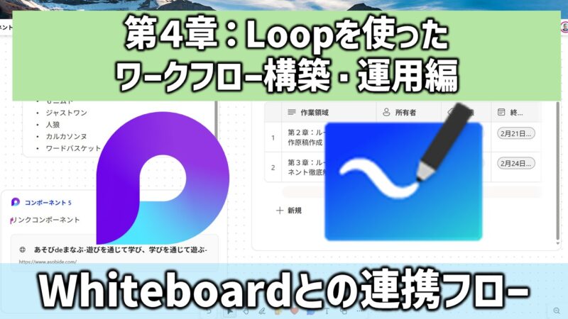 2026年3月1日 / 最終更新日時 : 2026年3月1日 大河一滴 アプリケーション 【ループ完全ガイド】第4章‐4:Microsoft Whiteboardとの連携ワークフロー ホワイトボードで自由にアイデアを描き出しながら、同時に Loop で企画の骨子やタスクを組み立てていく──。 Microsoft Whiteboard と Loop を組み合わせると、これまで別々に行っていた「発散」と「 […]