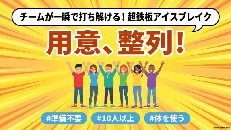 2026年3月28日 / 最終更新日時 : 2026年3月28日 大河一滴 ファシリテーション 【アイスブレイク】チームの相互理解が深まる!スピード勝負「用意整列!」 新しいチームが始動するときや、新メンバーが加わった際、「もっとお互いのことを知るきっかけが欲しい」と感じることはありませんか? そんな時におすすめなのが、広いスペースさえあれば道具なしですぐに始められるチームビルディング […]
