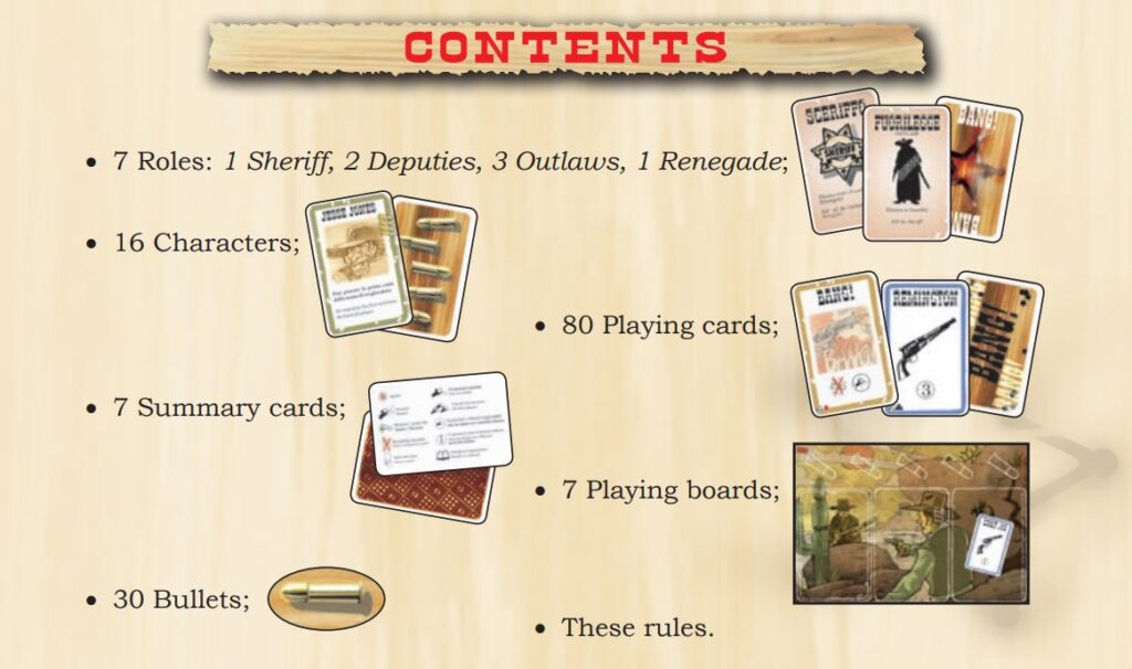 - 役割カード…7枚(内訳:保安官1枚・副官2枚・無法者3枚・反逆者1枚)