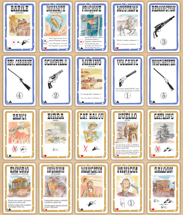 一部のカード(バレル、刑務所、ダイナマイト)には、カードの下にポーカースートと数字が描かれています。