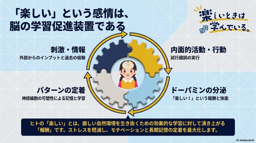 ヒトは地球上で最も「学習」に特化した生物ですが、その効率を最大化する鍵は「楽しい」という感情にあります。認知科学の視点で見ると、「楽しい」と感じることで分泌されるドーパミンは、学習のモチベーションを高め、記憶を定着させ、さらにストレスを軽減する役割を果たします。