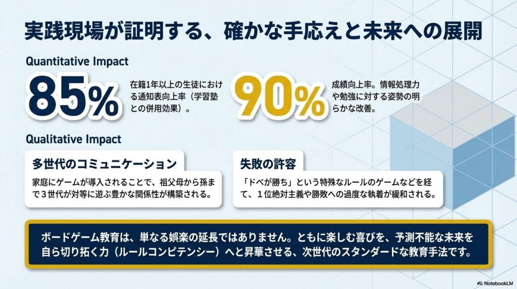 実際にボードゲーム教室の実践者からは、ボードゲームに親しんでいる子どもは、初めて見る複雑な難問に対しても「面白そう!」と前向きに挑戦できるようになると報告されています。