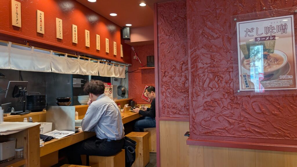 店内は木の温もりを基調に赤を差し色にした落ち着いた空間。カウンター5席、テーブル10席という構成で、一人でも入りやすく、友人同士や家族連れまで幅広く利用されている。清潔感が高く、女性客の姿もよく見かける。