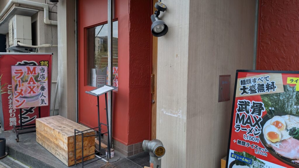 看板メニューの「武骨MAXラーメン」は、味玉やチャーシュー、海苔、ほうれん草などの具材が豪快に盛られている。さらに唐揚げ2個と“無限ライス”が付くボリューム満点のセットメニューも人気である。
