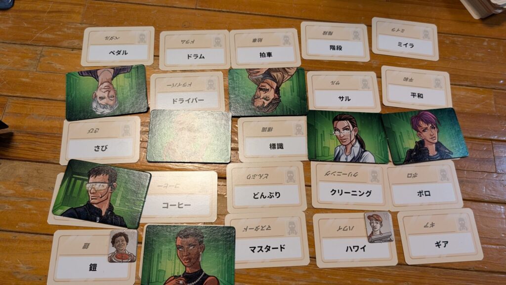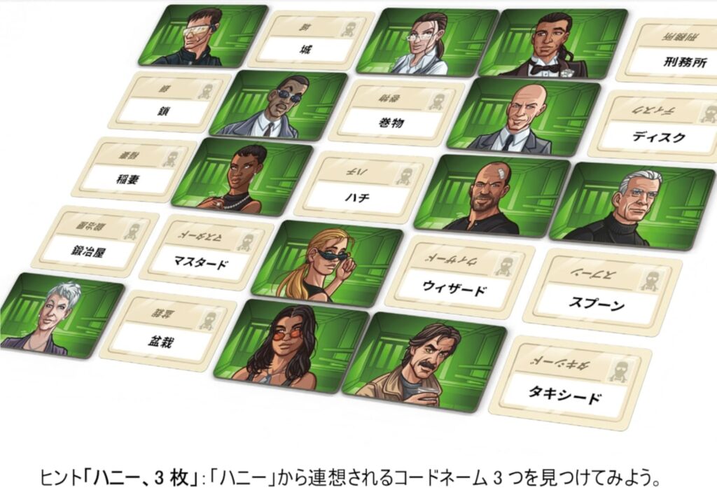 基本システムはオリジナルの「コードネーム」を踏襲。25枚の単語カードが5×5に並び、それぞれに正解・中立・暗殺者(NG)といった役割が割り当てられる。プレイヤーは互いに異なる“キーカード”を持ち、自分から見た正解ワードを、一語のヒントと数字だけで相手に伝えなければならない。