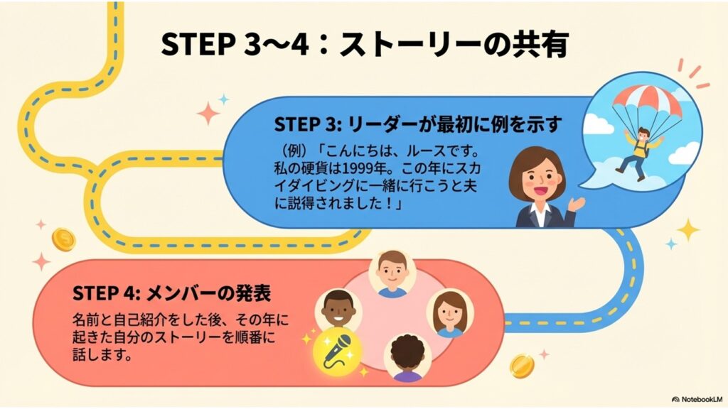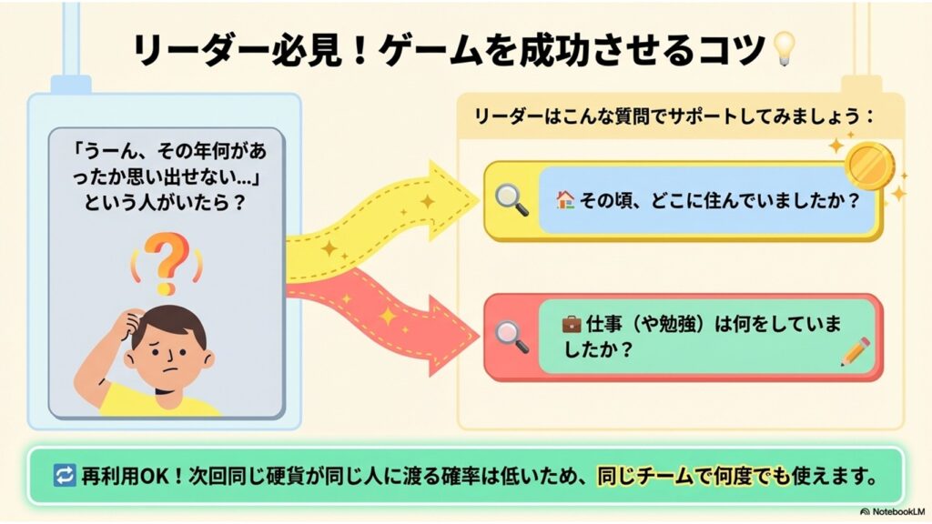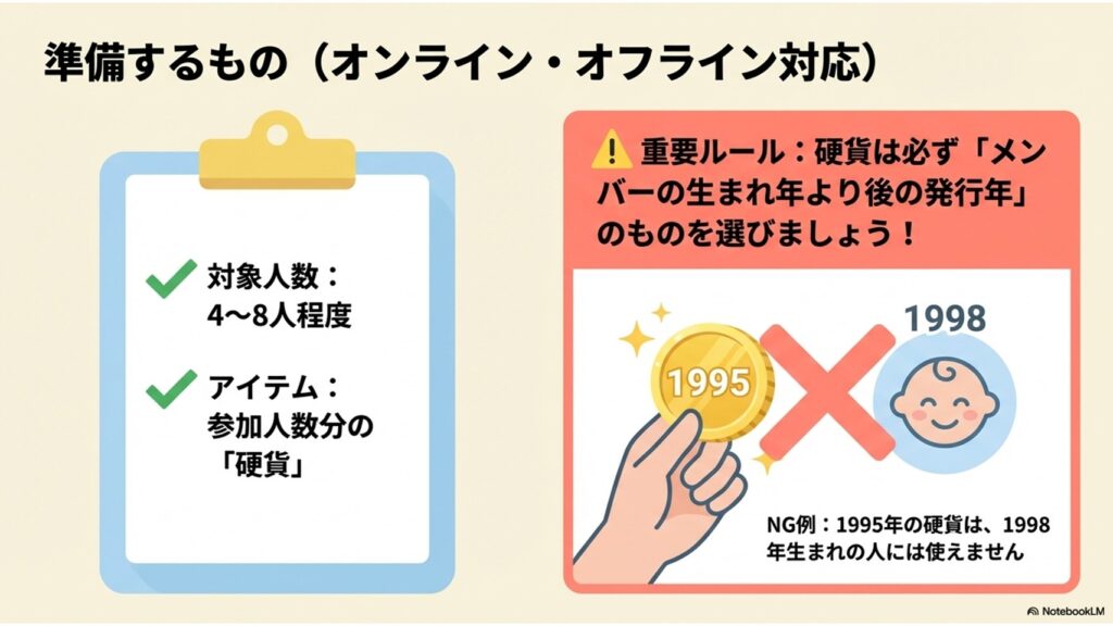 - 硬貨を配る: メンバーに1枚ずつ硬貨を配ります。この際、メンバーの生まれ年より後の発行年のものを選ぶようにしましょう。