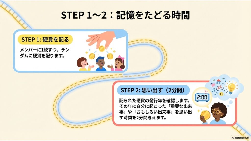 - 思い出す時間を作る: その硬貨が発行された年に、自分に起こった重要な出来事や面白いエピソードを思い出す時間を「2分間」与えます。