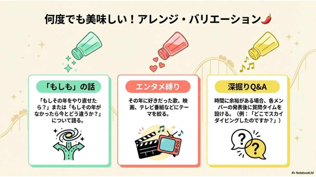 - if(もしも)の設定: 「もしその年をやり直せたら?」というテーマで話す。