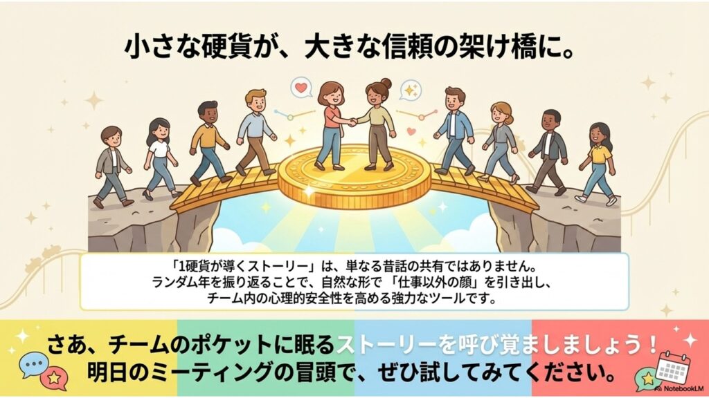 あなたも次回のミーティングの冒頭に、ポケットにある小銭を使って「硬貨が導くストーリー」を始めてみませんか?