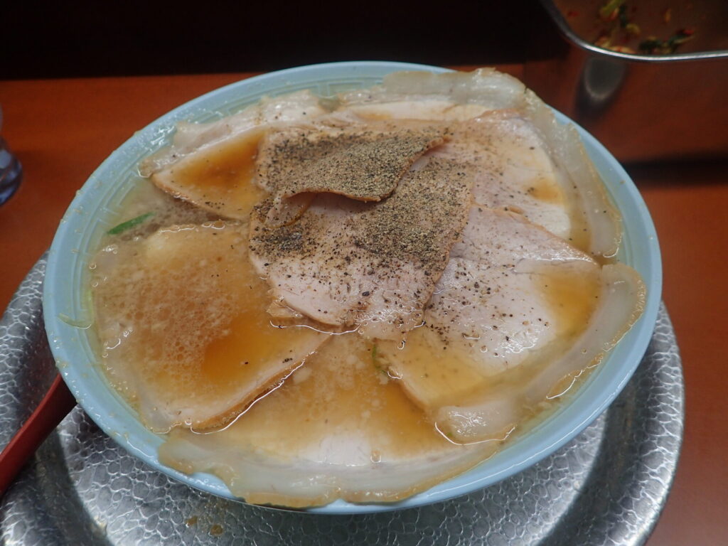 丼いっぱいに敷き詰められたチャーシュー、その上にたっぷりとふりかけられた胡椒がビジュアルの象徴だ。ほどよい塩気とコクのある醤油スープは、食べ進めるうちに不思議とクセになる味わい。チャーシューは見た目ほど重くはなく、どんどん箸が進む。麺は細めで柔らかめ。昭和の中華そばのような食感で、スープとの相性も心地よい。