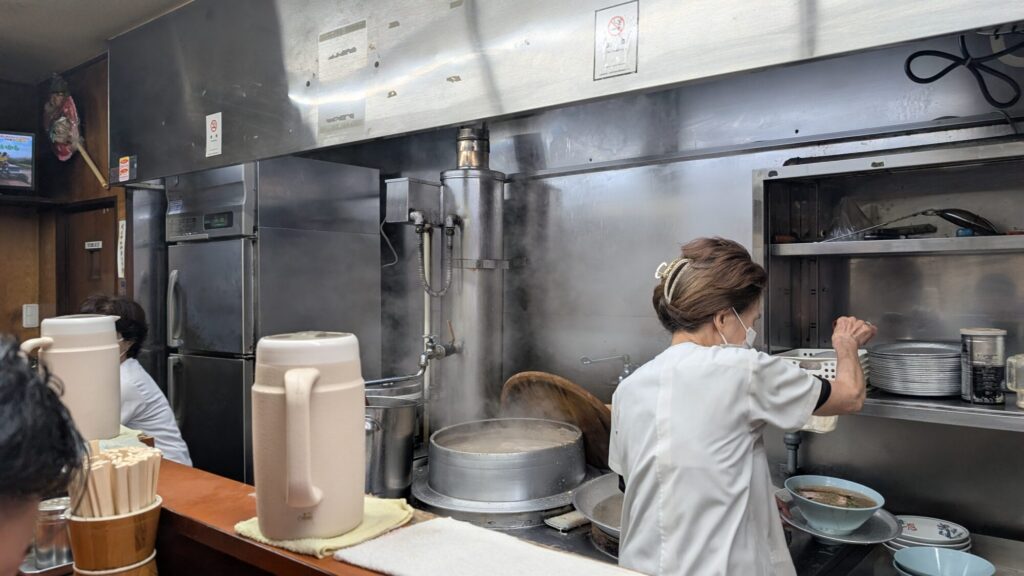 店内はカウンターのみのコンパクトな空間。どこか昭和のラーメン屋らしい温かみを感じる雰囲気で、豚骨の香りがふわりと広がる。常連客も多く、女性スタッフが丁寧に切り盛りする様子も親しみやすい。レトロな味わいが好きな人にはたまらない。
