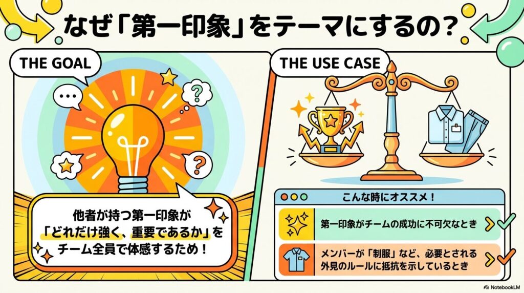 接客業や営業職など、チームの成功に「第一印象」が不可欠な場面は多々あります。しかし、制服などの規定の「外見」に対してメンバーが抵抗を感じている場合、その重要性を口頭で説明するだけでは不十分なこともあります。