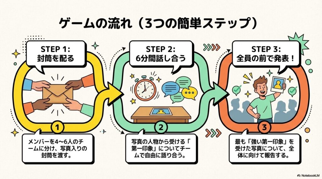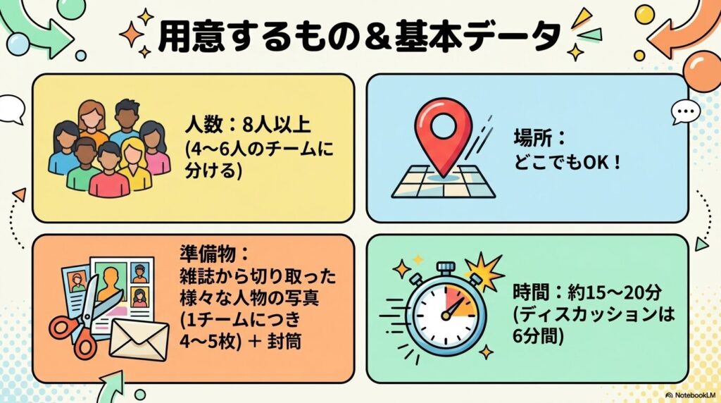 • 写真の配布: さまざまな人物の写真が入った封筒を各チームに渡します。