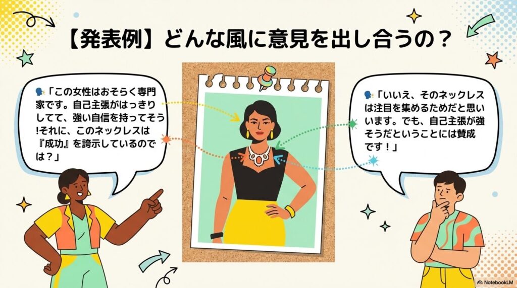 「この女性はおそらく何かの専門家です。毅然とした様子や、はっきりとした自己主張から強い自信を感じます。身につけているネックレスも、成功を誇示している(あるいは注目を集めるため)のように見えます」といった具合に、具体的な根拠を挙げて共有します。