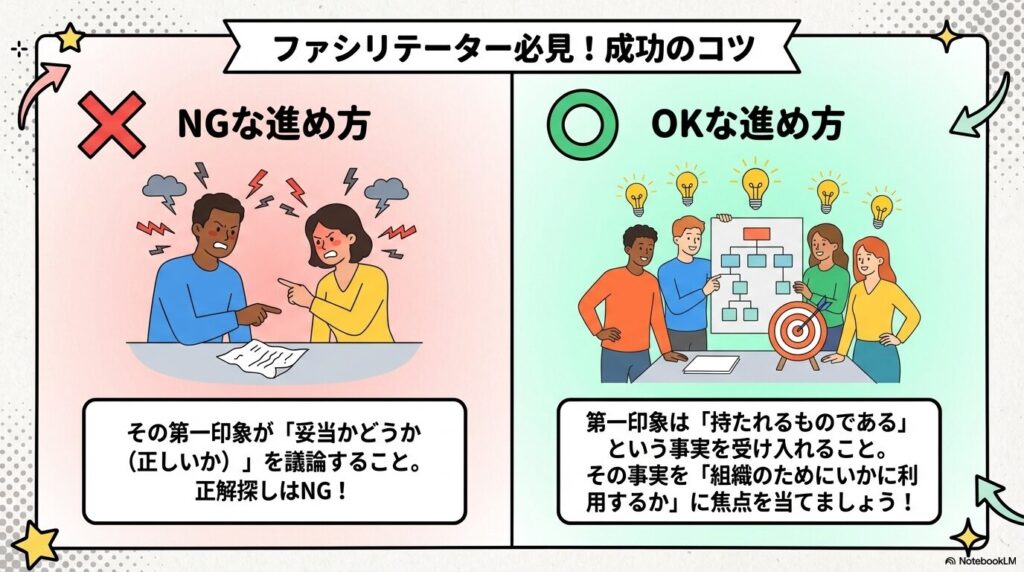• 印象の妥当性を議論しない: 「その第一印象が正しいかどうか」を話し合ってはいけません。大切なのは、「第一印象は(良くも悪くも)持たれてしまうもの」であるという事実を受け入れることです。