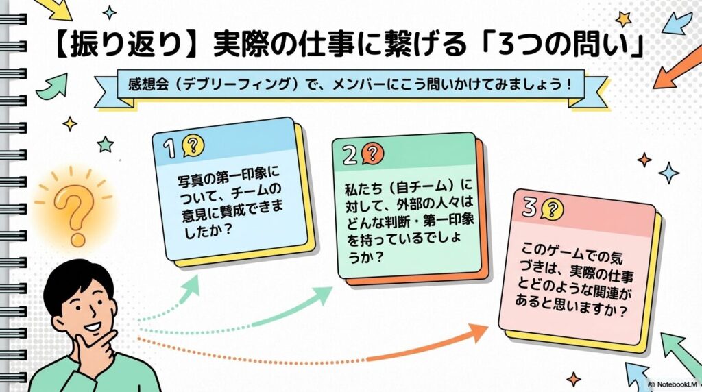 ゲーム終了後には、メンバーに以下のような質問を投げかけてみてください。