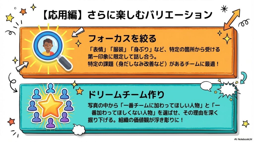 • 観点を絞る: 表情、服装、身振りなど、特定の箇所から受ける第一印象に限定して話し合います。