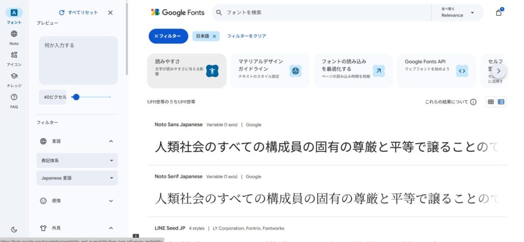 - すると、利用可能な日本語フォント(例:Noto Sans JP, さわらびゴシック, M PLUS 1pなど)がずらりと並びます。