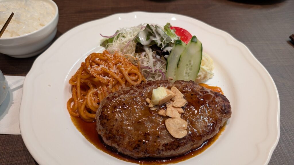 ハンバーグはサイズ感も良く、ランチタイムはライスの大盛無料という点も高評価。
