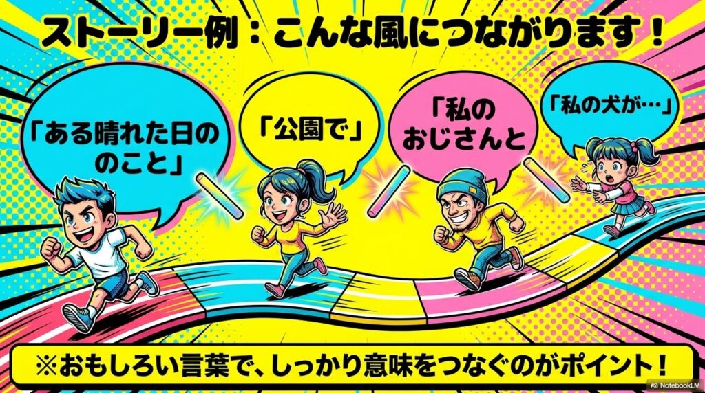 「ひと言リレーのストーリー」は、予期せぬ展開を楽しみながら、**「他者の言葉をどう受け取り、次へ繋げるか」**というコミュニケーションの本質を学べるゲームです。
