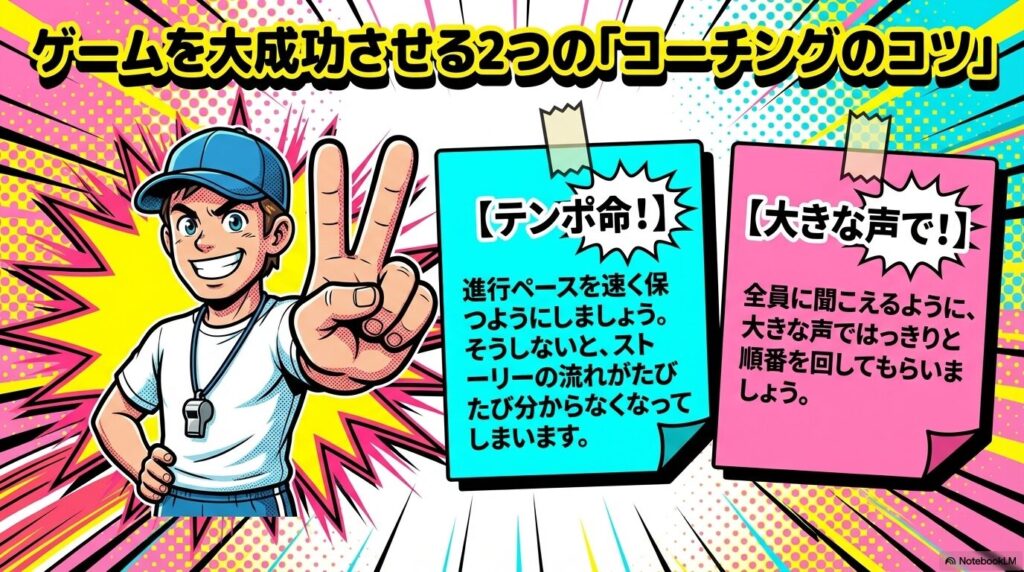 • 進行ペースを速く保つ: テンポが遅くなるとストーリーの流れが途切れてしまうため、リズム良く進めましょう。