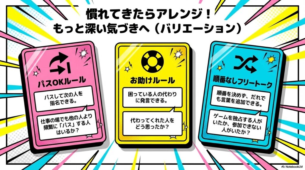 • 助け舟: 困っている人がいたら、他の人が代わりに発言することを許可します。