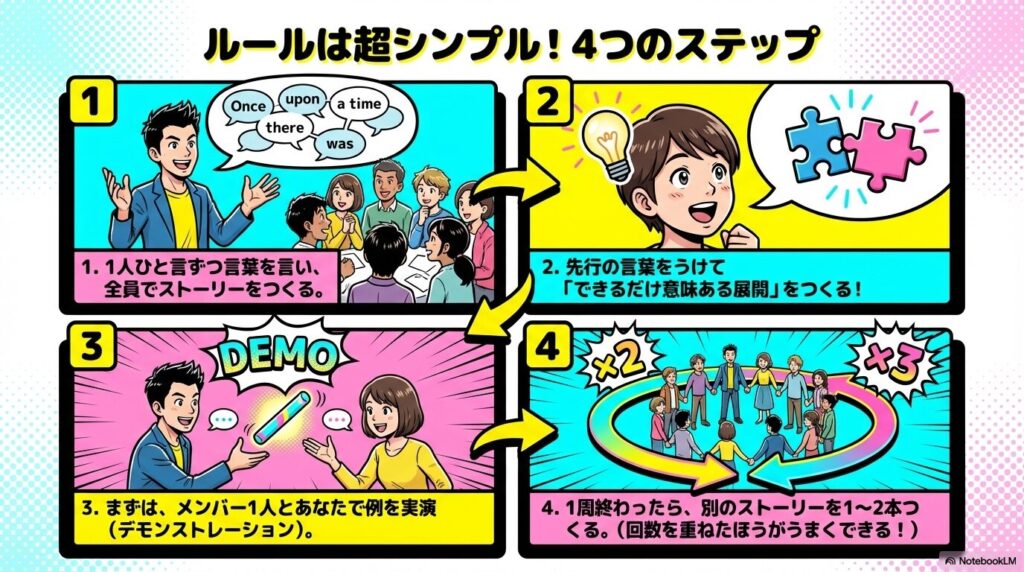 • ルールの説明: 全員で一言ずつ言葉を言い、物語を作ることを説明します。