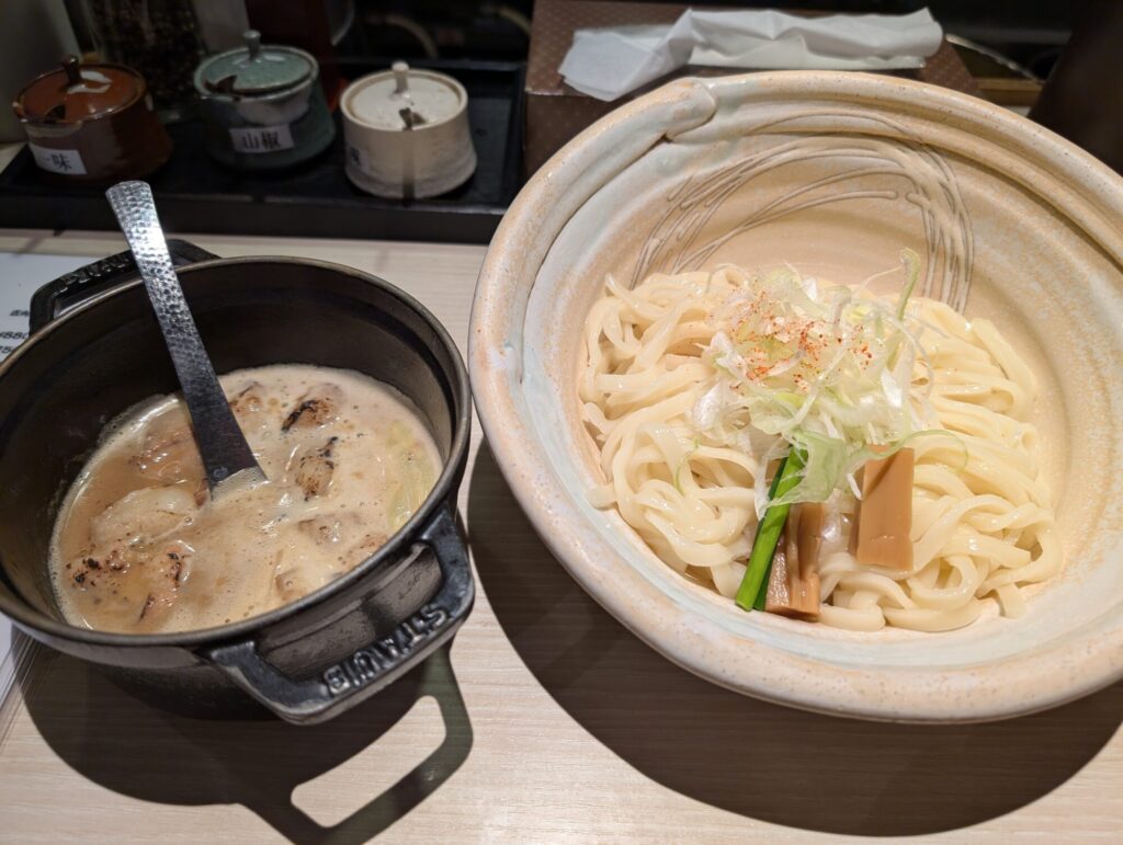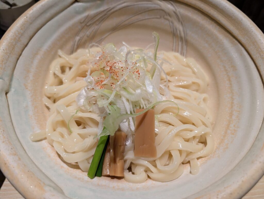 「ほそ道」の唯一無二の特徴が、店内で毎朝打つ“無かんすい麺”。小麦・水・塩のみで作る潔さが、ほのかな香りともちもちの弾力、そしてつけだれとの高い相性を生みます。