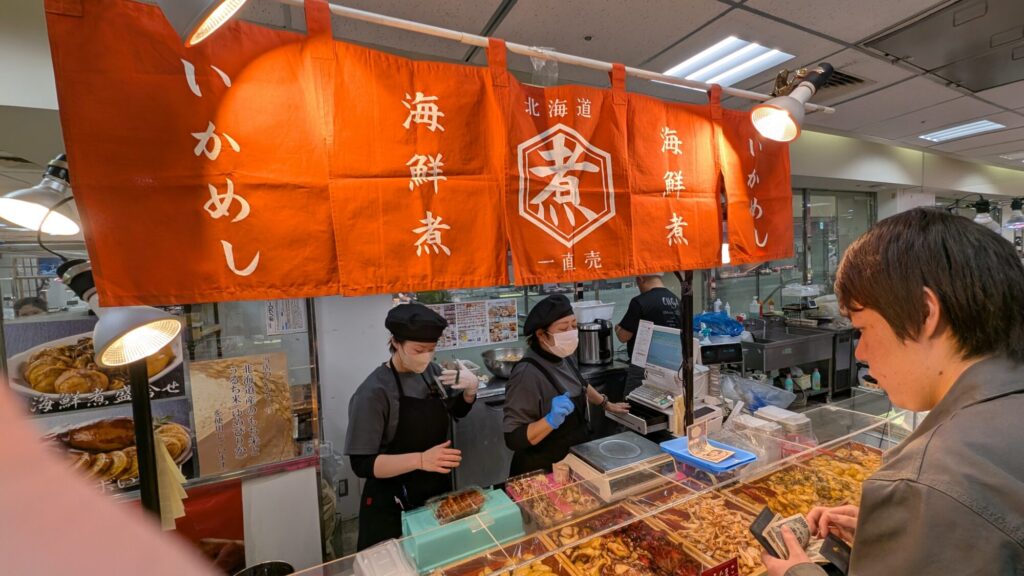 「北海道一直売」の名物「いかめし」は、通常の約1.5倍というジャンボサイズが魅力の老舗名物。イカの胴にもち米がぎっしり詰まり、柔らかく煮上げられたイカの旨味がご飯にしっかり染み込んだ満足度の高い一品です。物産展でも存在感抜群で、ボリュームと味わいの両方を楽しめる“豪快いかめし”として人気を集めています。