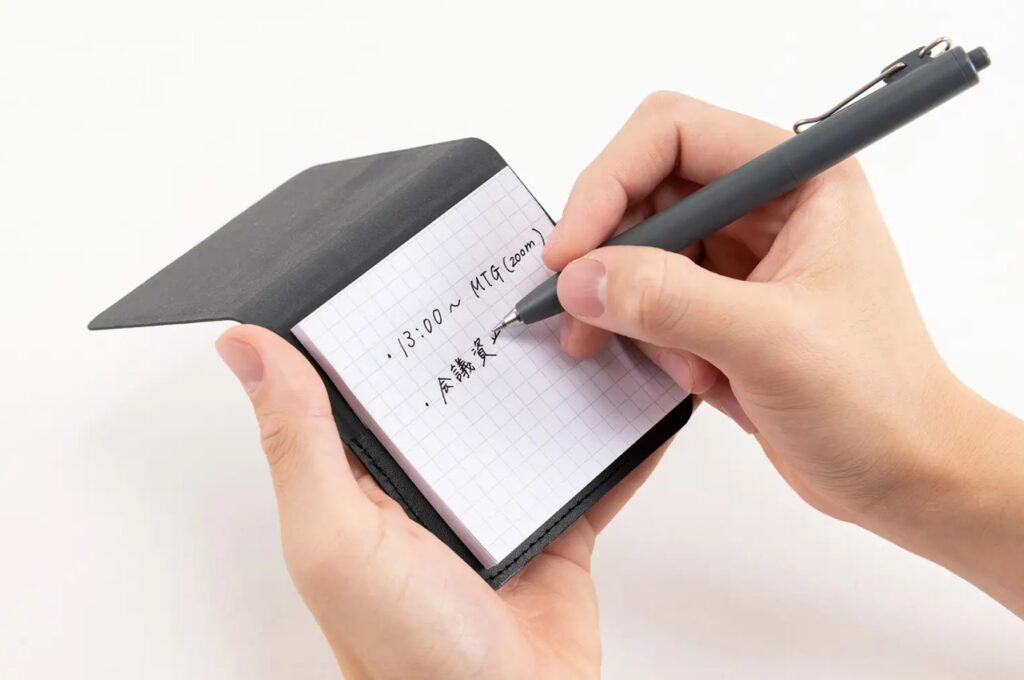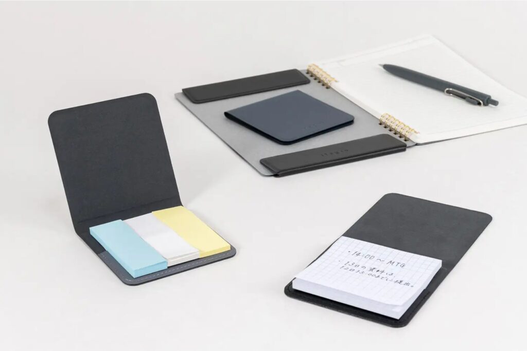 落ち着いた質感とミニマルな外観がカッコいい。75×75mmまでのの付箋を収納可能だ。これを使えば、カバンの中で付箋が折れたり汚れたりするのを防止してくれる。
