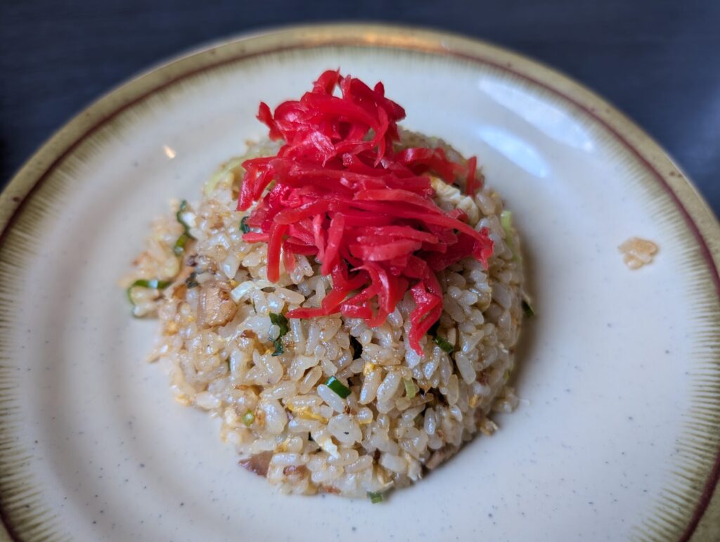 半チャーハンでもボリューム満点。餃子は野菜の甘みが際立ち、高菜や紅生姜との相性も抜群です。