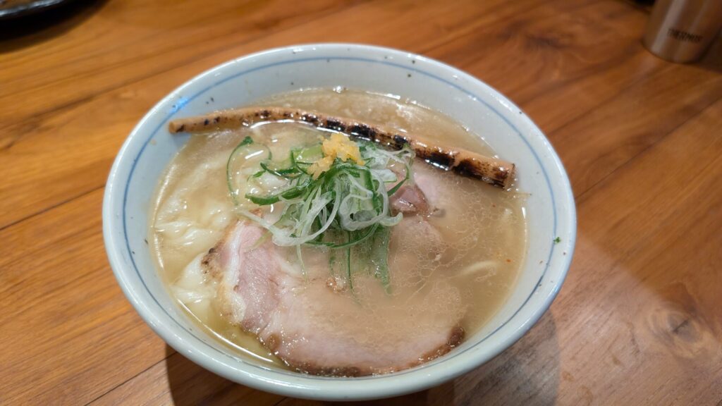 提供される看板メニューは「蟹塩そば」(1,000円)と「貝塩そば」(900円)の2本柱。運ばれてきた瞬間に思わず声が漏れるほど美しいビジュアルで、こんがりと焼き目がついた姫竹メンマ、炭火焼チャーシュー2種、ぷりぷりのワンタンが器の中で存在感を放つ。