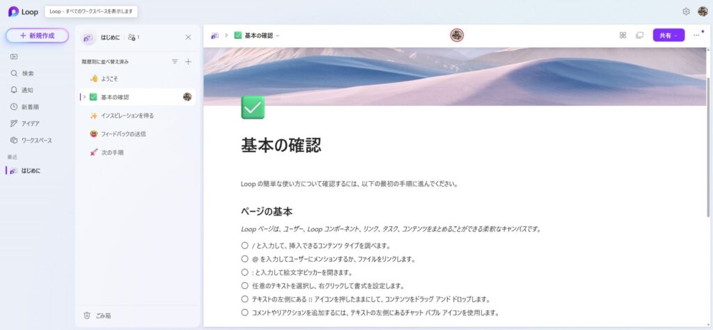 個人アカウントの Loop には、最初から「はじめに」ワークスペースが用意されており、Loop の基本を学べるページが入っています。初心者でも迷わず使い始められるように設計されています。