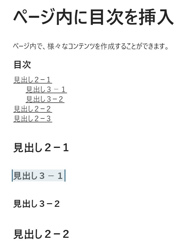 長文のページ等を制作する時は、区切り毎に「見出し」をつけながら作成しましょう。「見出し」をつけていると、後から「+で「目次」」を選択すると、見出し毎の内部リンク付き目次が自動生成されます。