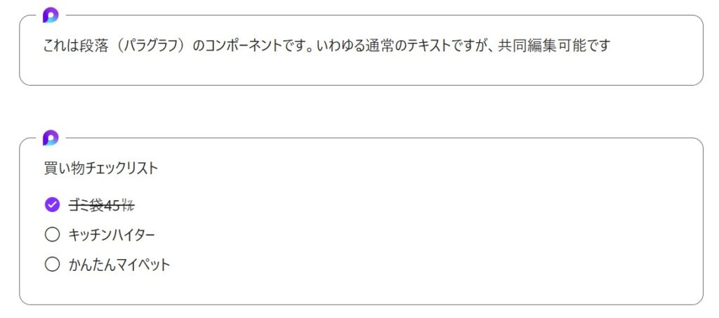 Loop の最大の特徴のコンポーネント。 ページ内だけでなく、Teams や Outlook に貼り付けても 同期されたまま編集が可能です。コンポーネントについては後の記事や章で詳しく解説します。