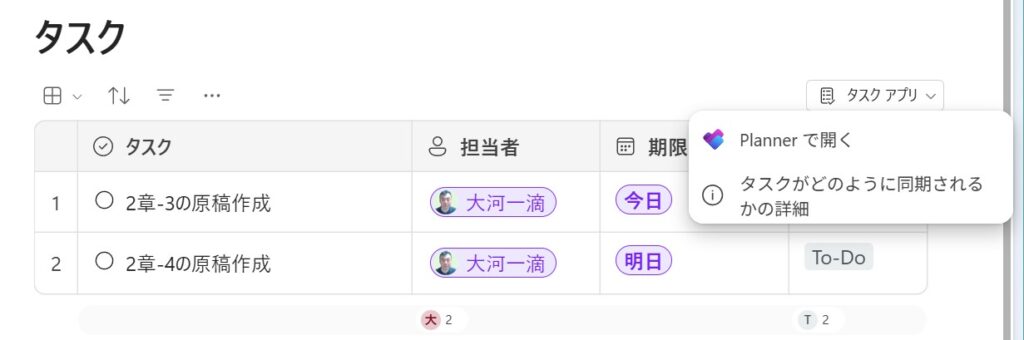 チェックボックス付きのタスクを作成できます。 ページ内で作成したタスクは、担当者のPlannerなどのアプリと自動で連携されます。後の章でも取り上げる Planner や To Do との連携にもつながる重要要素のひとつです。