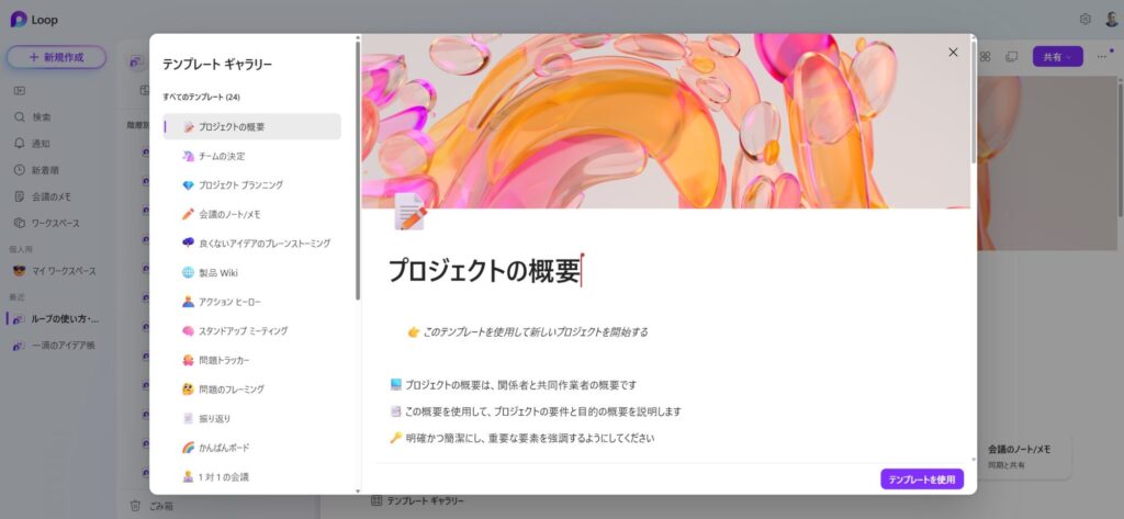 Loop には「会議メモ」「プロジェクト計画」など、様々な種類のテンプレートが用意されています。