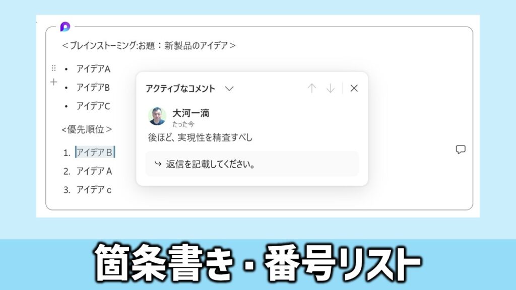 箇条書きと番号リストは、Loop の中でも 最も使用頻度が高い基本コンポーネントです。 一見シンプルですが、実務では「どう並べるか」「どこまで書くか」で読みやすさが大きく変わります。