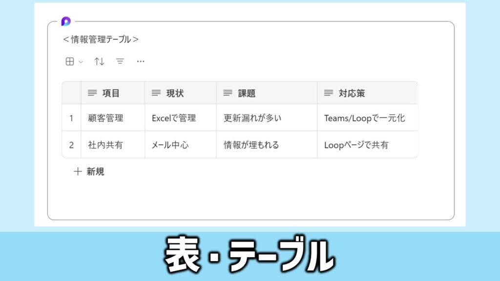 テーブルは、Loop コンポーネントの中でも 最も応用範囲が広い“万能ツール” です。 情報整理、比較表、タスク管理、ヒアリングメモなど、ビジネスのあらゆる場面で活躍します。