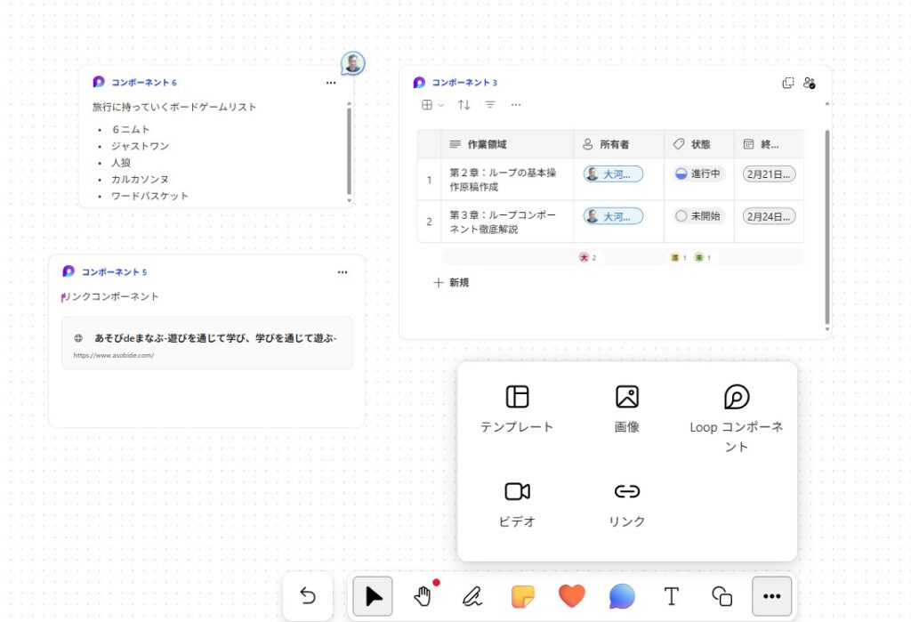 キャンバス上部のツールバーから、「その他オプション」(・・・アイコン)を選択します。 ここには、付箋・画像・ドキュメントなどと並んで、Loop コンポーネントを追加するための項目が含まれています。