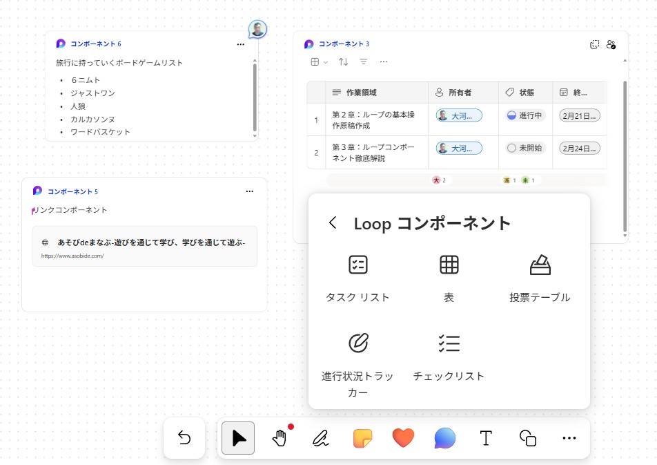 Whiteboard の自由なレイアウトの中に、構造化された Loop を組み込めるのが大きな特徴です。