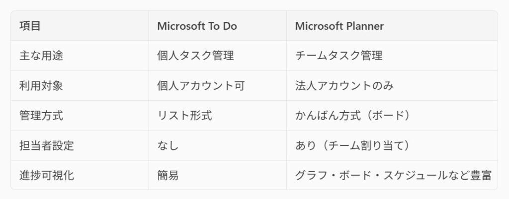 Microsoft To Do は、シンプルで使いやすく、個人の生産性向上に最適なツールです。一方、Planner は小〜中規模のチームでのタスク管理に強く、特に Microsoft Teams との連携によって、リモートワーク環境で威力を発揮します。