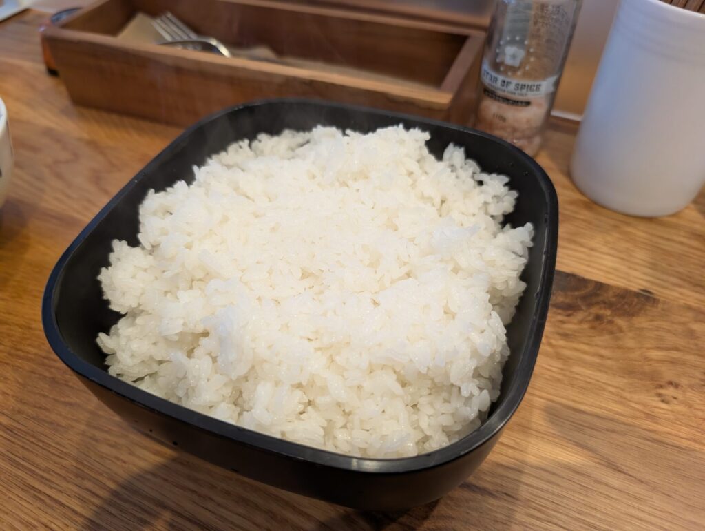 グリルmoriのもう一つの名物が、おひつで提供されるご飯のおかわり自由サービス。アツアツのご飯を好きなタイミングでよそって食べられ、肉料理との相性も抜群です。