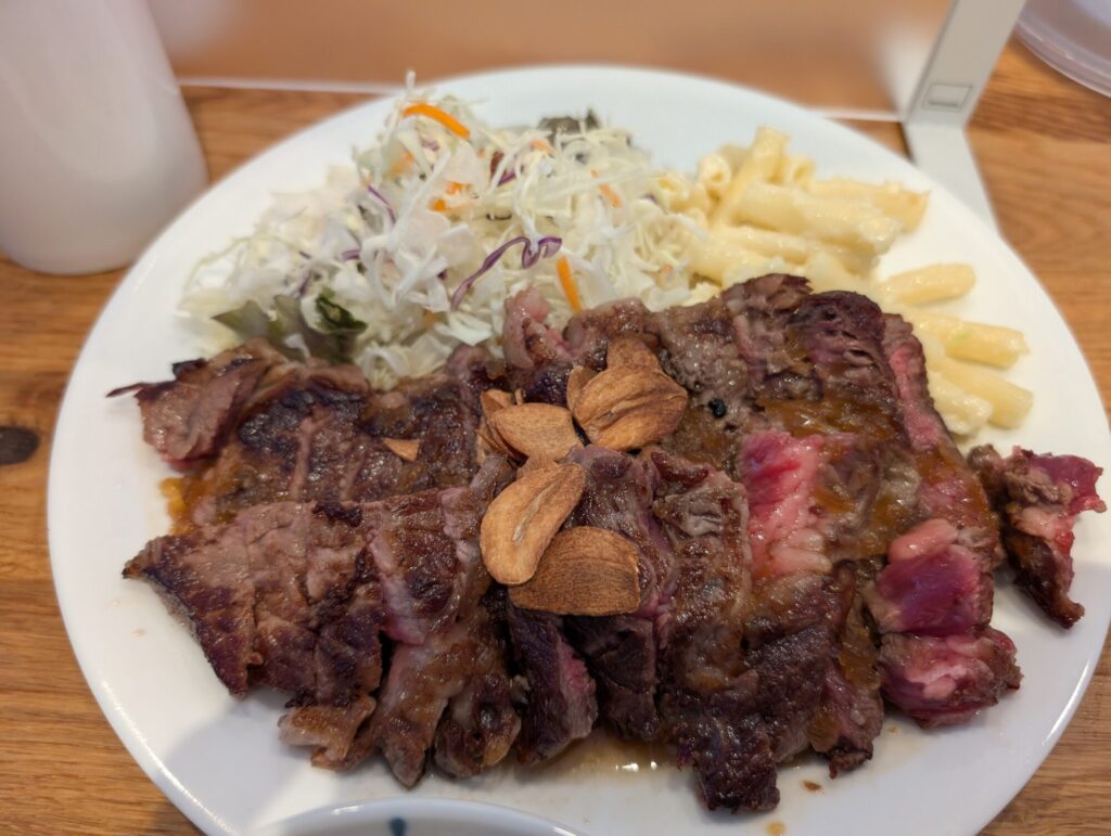 焼き加減は絶妙で、醤油ベースの優しいステーキソースとガーリックチップの香ばしさが食欲を加速させます。食べやすいサイズにカットされて提供されるのも嬉しいポイント。