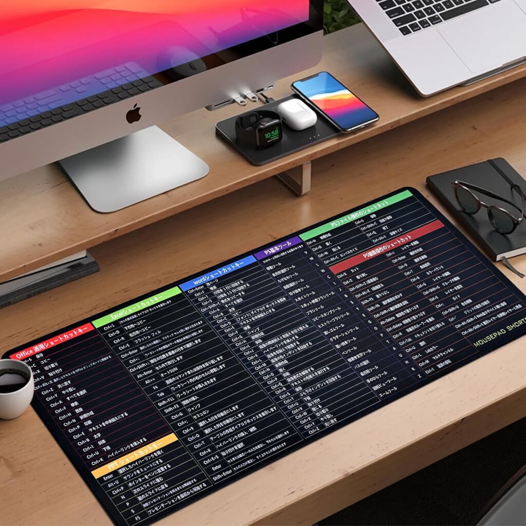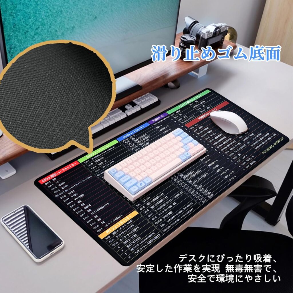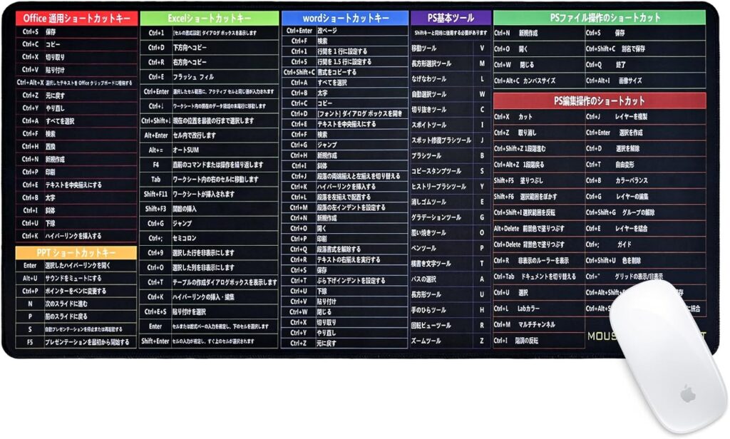 そんな願いを叶えてくれるのが、「ショートカットキー表付きマウスパッド」です。表面にExcelなど主要オフィスソフトのショートカットキーが一覧化されており、「あの操作どうやるんだっけ?」という迷いを瞬時に解決。初心者から上級者まで、多くのユーザーに“作業スピードの底上げ”を実感させてくれる頼もしいアイテムです。