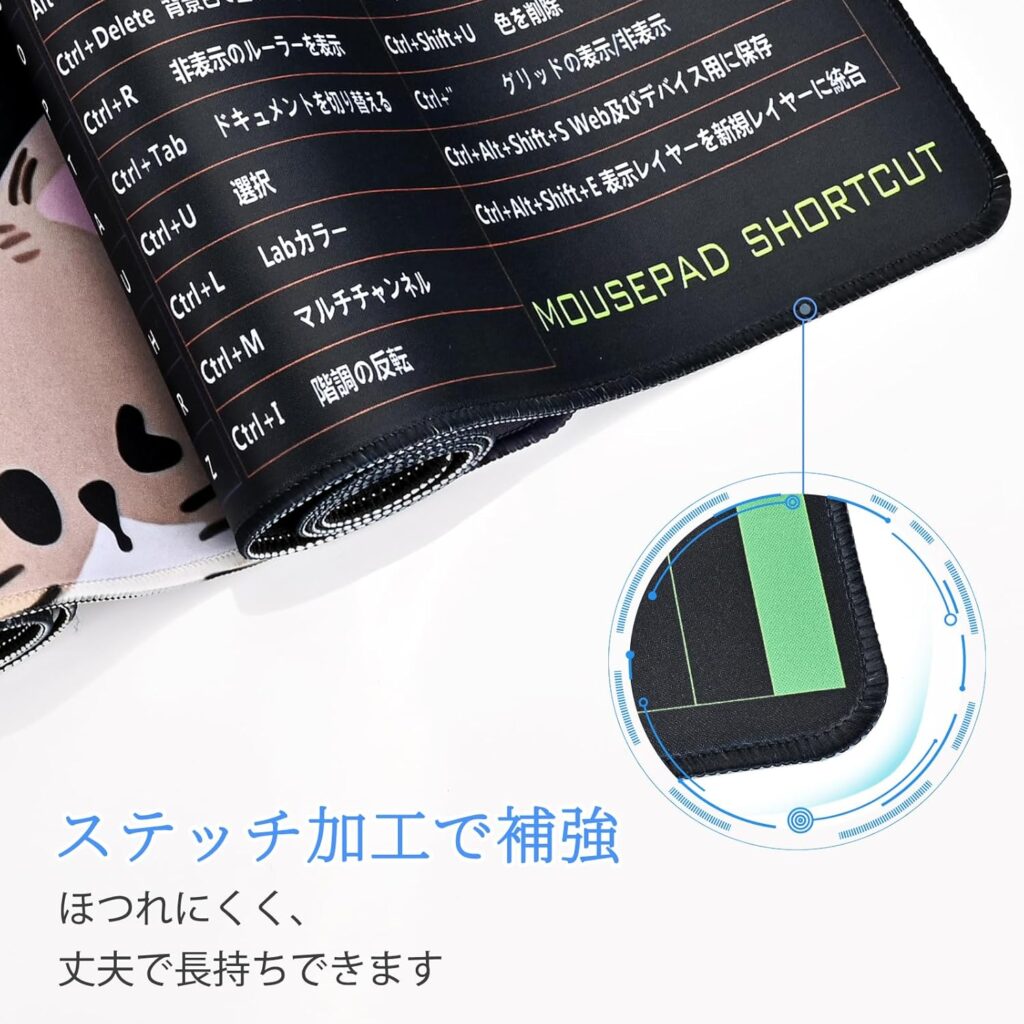 エッジ部分は ステッチ加工で補強されており、ほつれにくく長く使える設計。大型マウスパッドは毎日触れるアイテムだからこそ、耐摩耗性の高さは大きな魅力です。ワークデスク・学習机・ゲーム環境のどれにも合わせられる堅牢性を備えます。