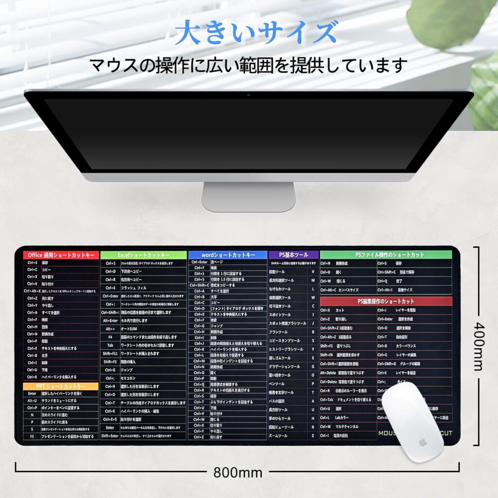 特にExcelは機能が多く、ショートカットを活用するかどうかで作業時間が大きく変わります。例えば、セル移動・書式設定・操作履歴といったよく使う動作も、このマウスパッドがあればいつでも参照可能。学習ツールとしても優秀で、使っているうちに自然とキー操作を覚えられます。