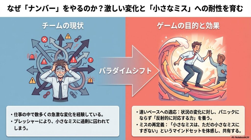 「仕事で小さなミスをしたとき、私たちは通常どんな反応をしますか?」という問いに対し、このゲームは「ミスにとらわれすぎず、変化した状況に即座に適応すること」の重要性を教えてくれます。