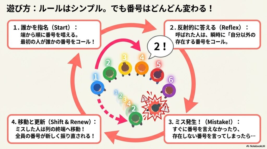- ミスの発生: すぐに番号が出てこなかったり、間違った番号(自分の番号や存在しない番号)を言ったりしたらストップです。