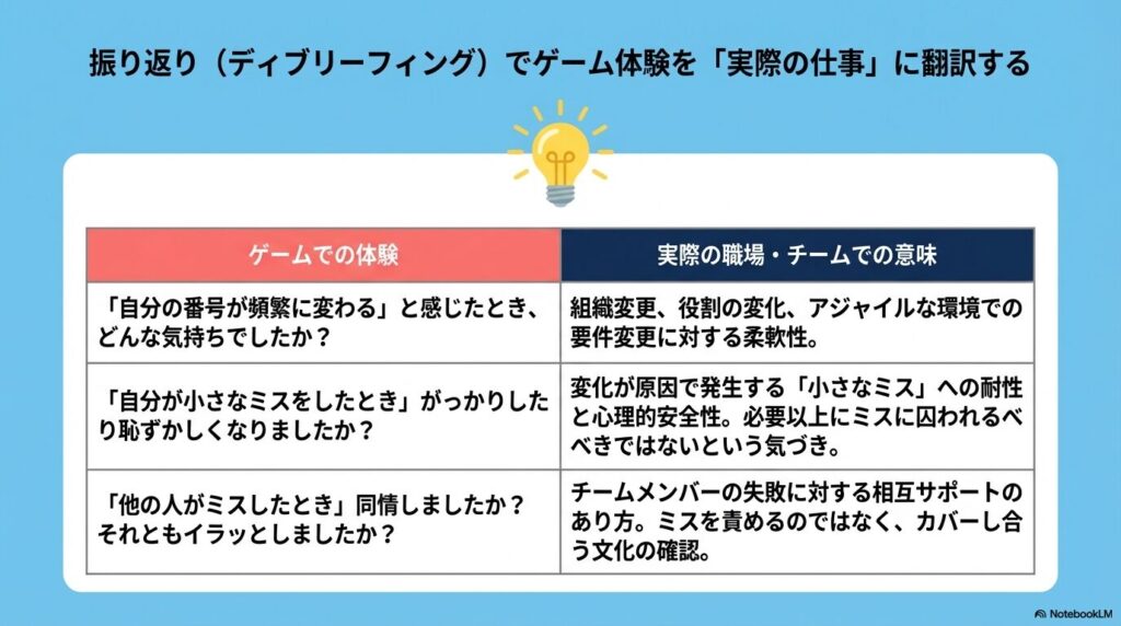 ゲームが終わったら、以下の質問を投げかけて仕事への学びに繋げましょう。